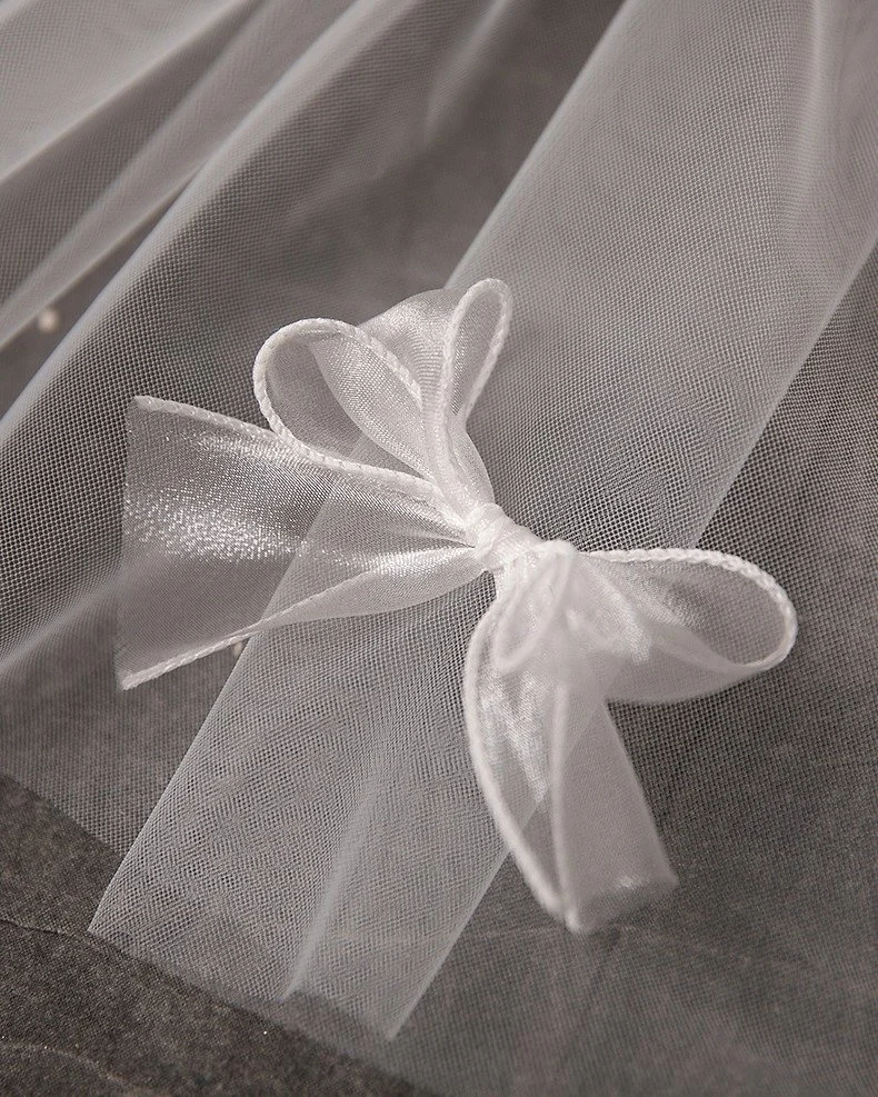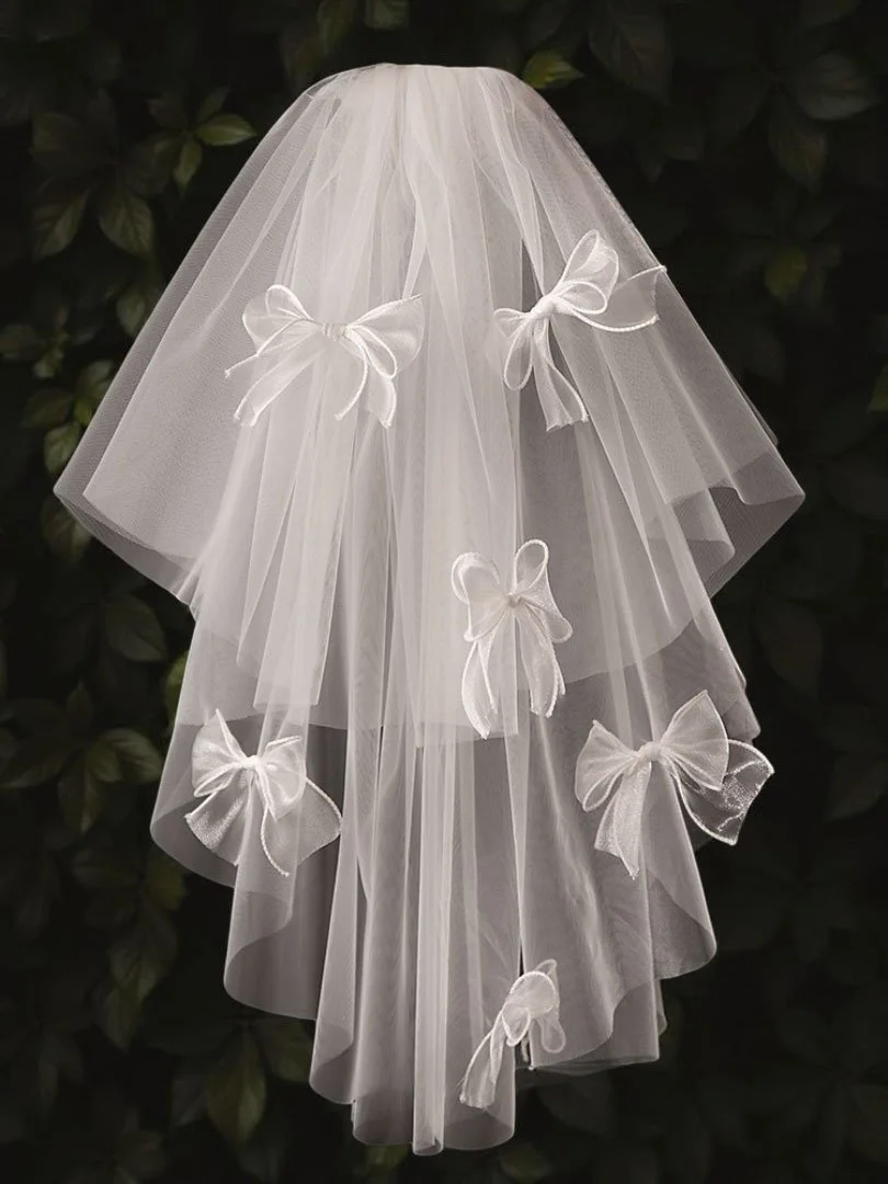 Esme Two Tier Bow Veil Back view of mid-length off-white two-tier wedding veil with bow detail Mid-length off-white bridal veil with two tiers and bow, side view Two-tier mid-length off-white wedding veil featuring a bow, shown from back Side view of mid length two tiers bow wedding veil in off white tulle