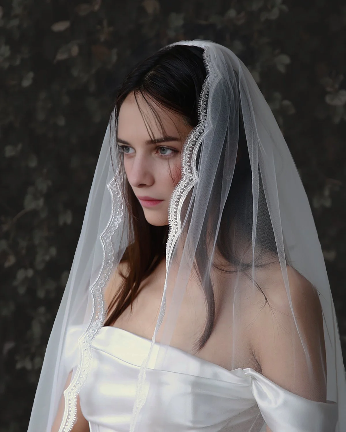 Romantic bridal portrait featuring full Chantilly lace veil with intricate floral details and soft lace edges.